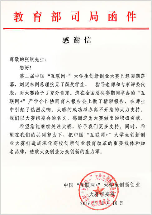 2018年,搜狐体育连续多年为中国国际互联网+大学生创新创业大赛做出积极贡献,获教育部来函致谢。
